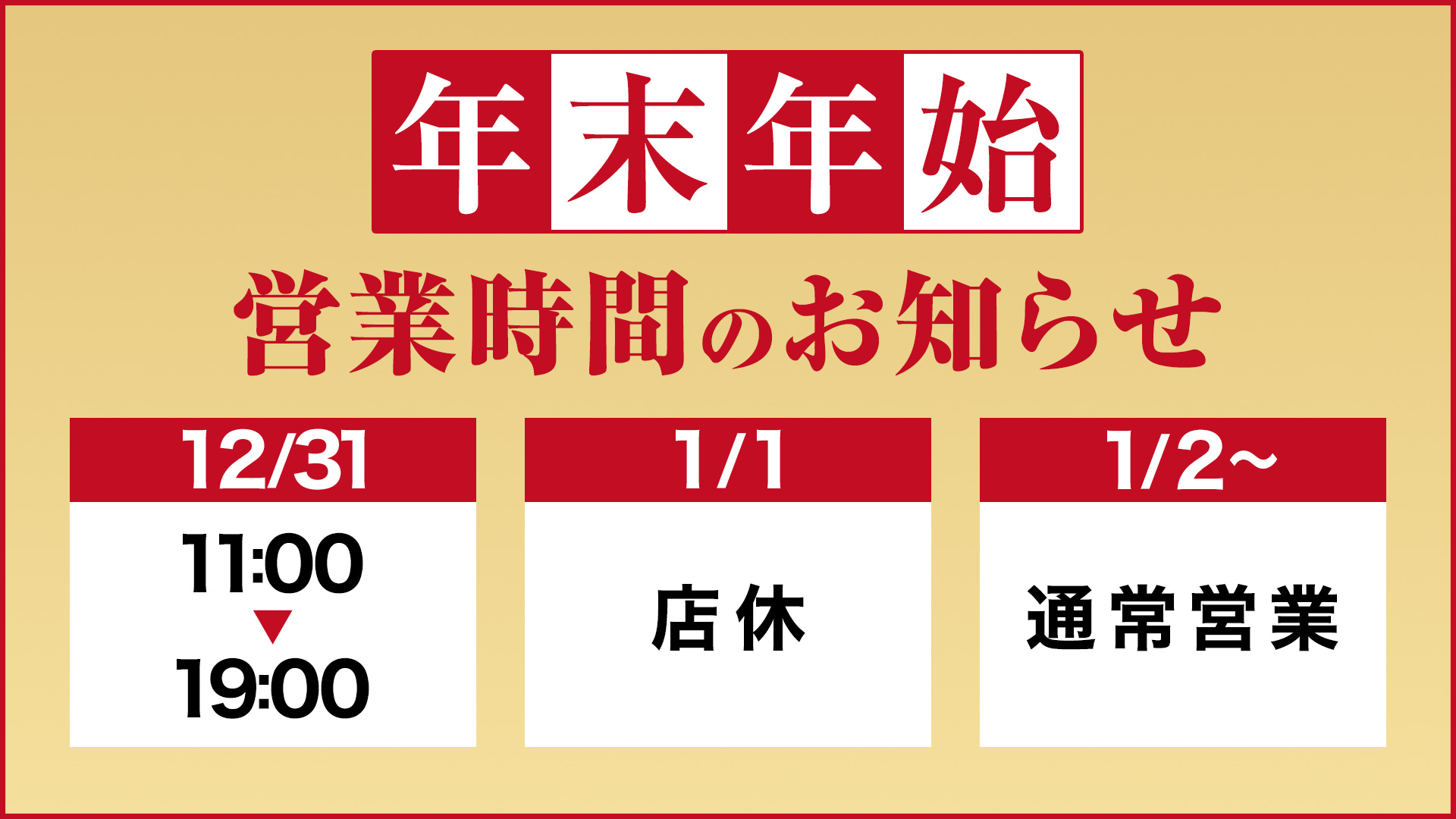より一層のご支援を賜りますよう、お願い申し上げます。 なお、誠に勝手ながら、年末年始は下記の日程で休業させていただきます。